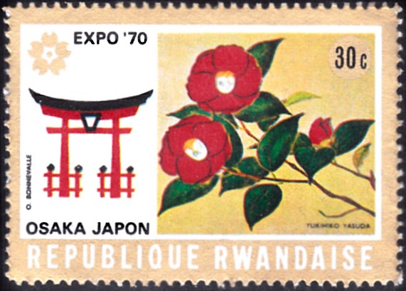 Auf dieser Marke (MiNr 393 A) aus Ruanda zur EXPO'70 in Osaka wird ein Blumengemälde von Yasuda Yukihiko gezeigt.