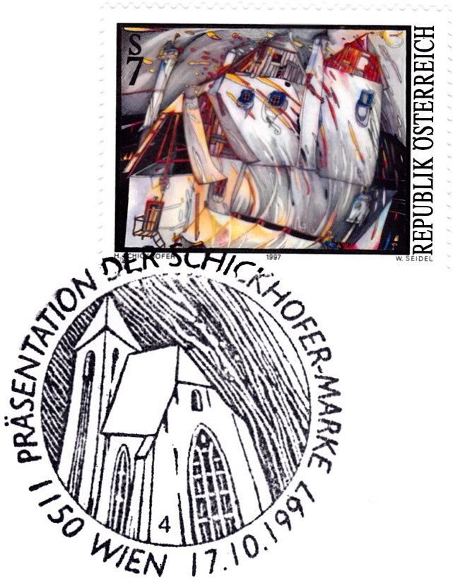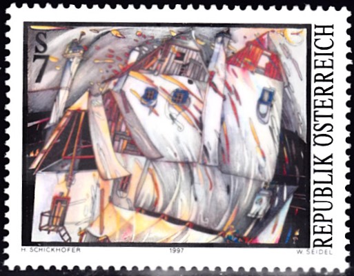 Auf einer Marke aus Österreich (MiNr 2234) ist das Gemälde "Haus im Wind" von Helmut Schickhofer zu sehen.