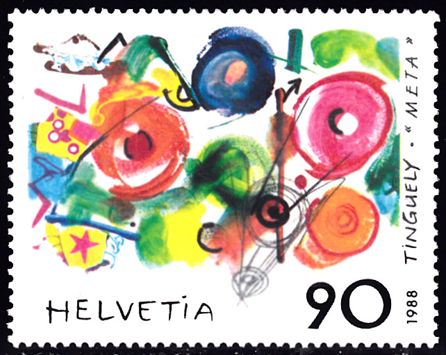 Aus der Schweiz kommt diese Marke (MiNr 1380) mit dem Gemälde "Métamécanique" von Jean Tinguely.