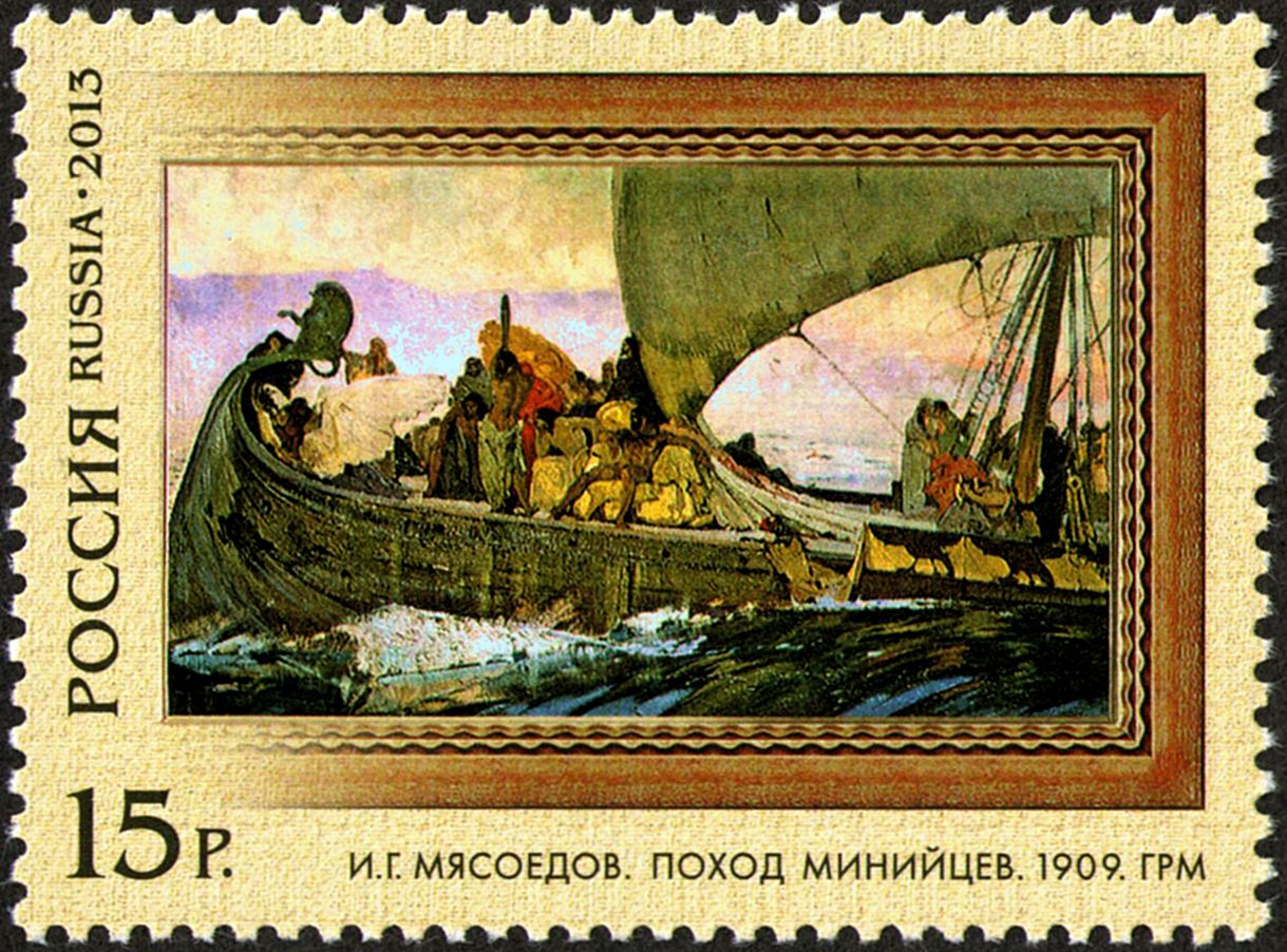 Zum 60. Todestag von Eugen Zotow ist in Russland diese Marke (MiNr 1961) mit dem Gemälde "Argonautenfahrt" von Eugen Zotow erschienen.