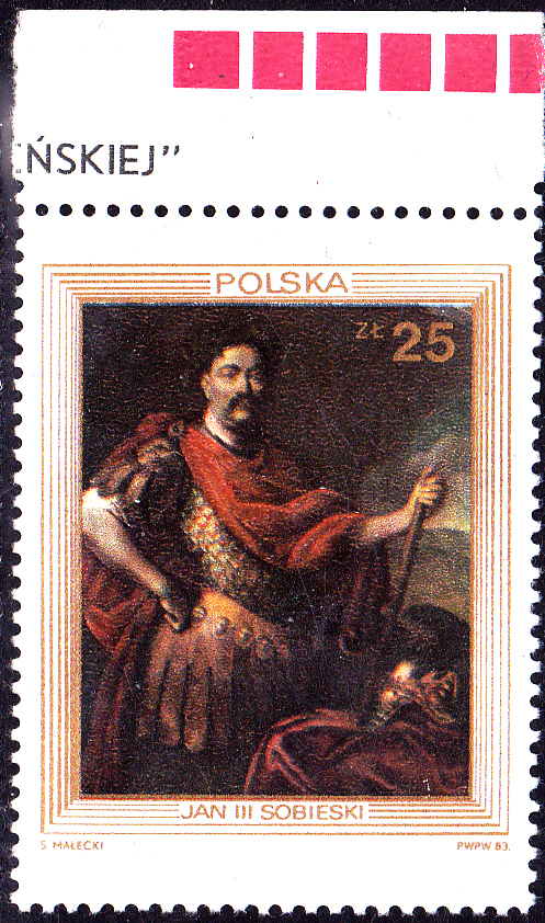 Eine Marke aus Polen (MiNr 2881) zum 300. Jahrestag des Sieges über die Türken am Kahlenberg bei Wien zeigt das Gemälde "König Johann III. Sobieski" von Jerzy Siemiginowski-Eleuter.
