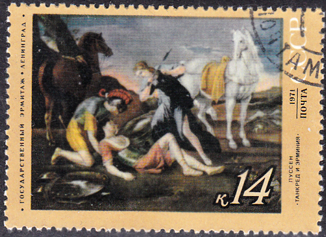 In einer Serie der Sowjetunion erschien diese Marke (MiNr 3902) mit dem Gemälde "Tankred und Herminia" von Nicolas Poussin.
