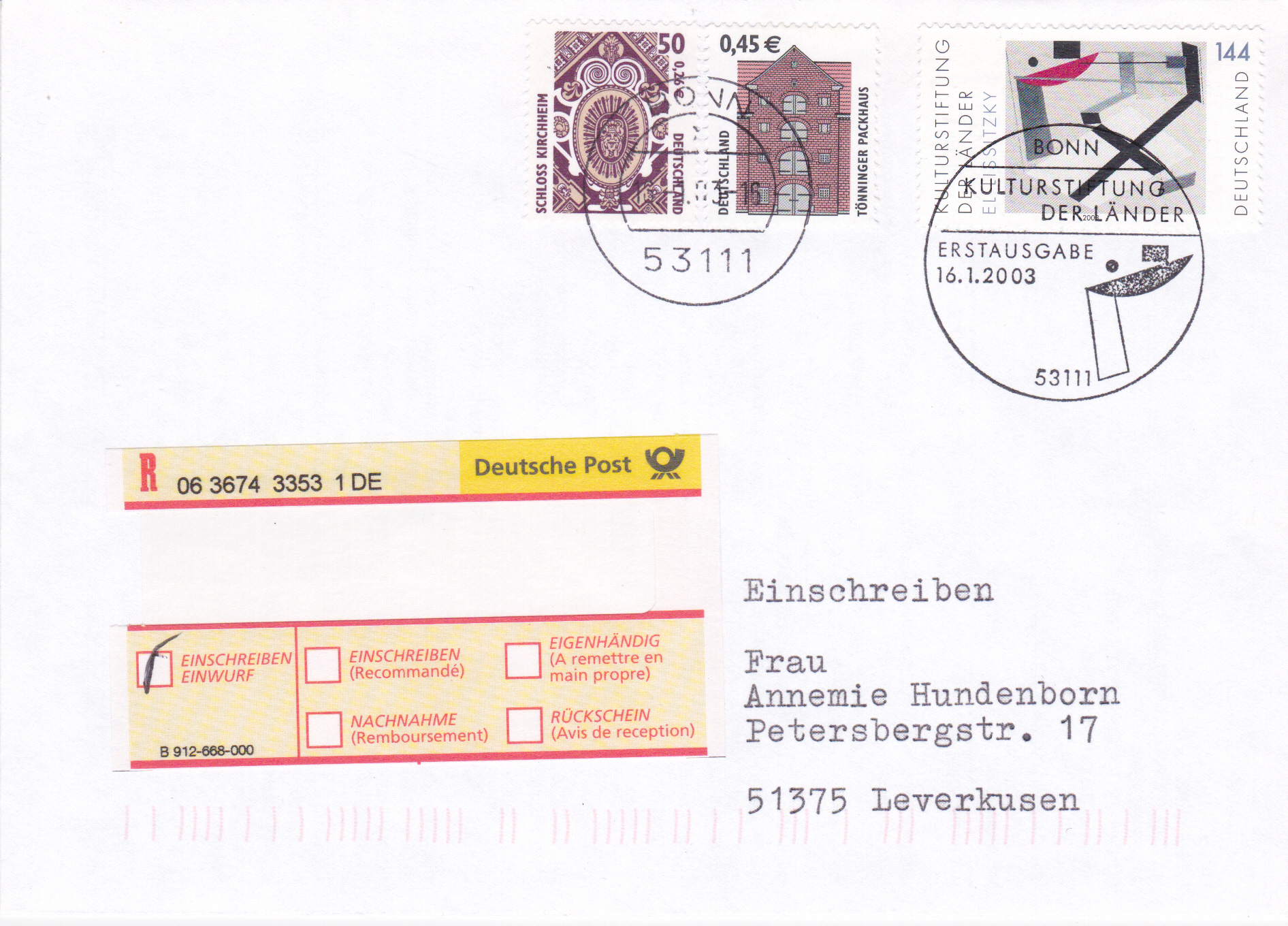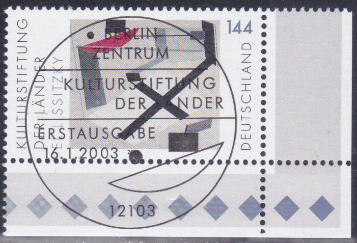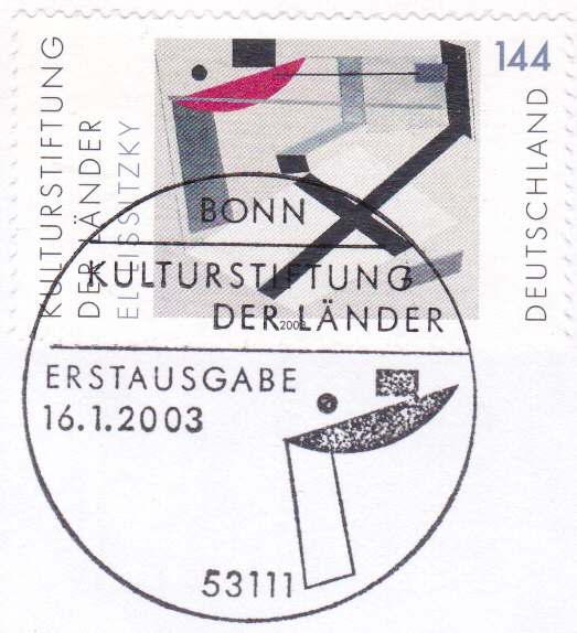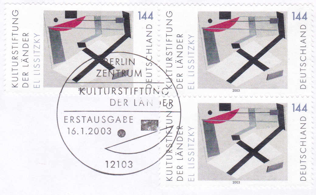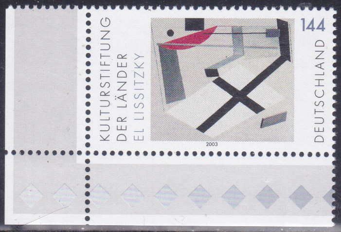 Auf einer Marke der Deutschen Post (MiNr 2308) sehen wir das Gemälde "Proun 30t" von El Lissitzky.