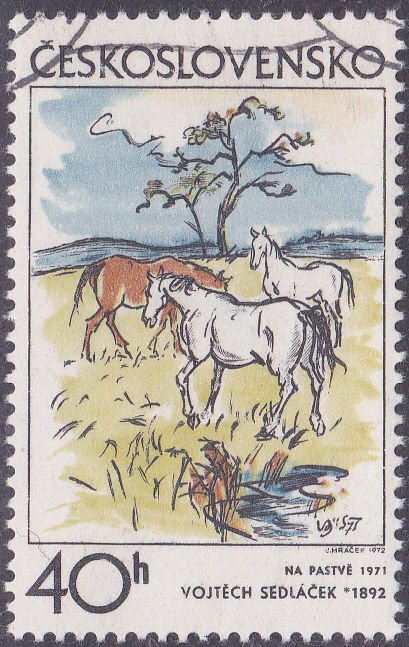 In einer Serie "Tschechische und slowakische Graphik" erschien on der Tschechoslowakei diese Marke (MiNr 2060) mit der kolorierte Zeichnung "Auf der Weide" von Vojtech Sedláček.