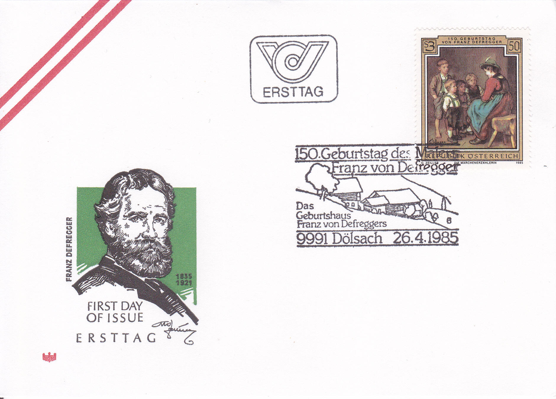 FDC mit der Marke zum 150. Geburtstag von Franz Defregger mit einem Sonderstempel vom 26.4.1985 aus Dölsach. Der Stempel zeigt das Geburtshaus von Franz Defregger.