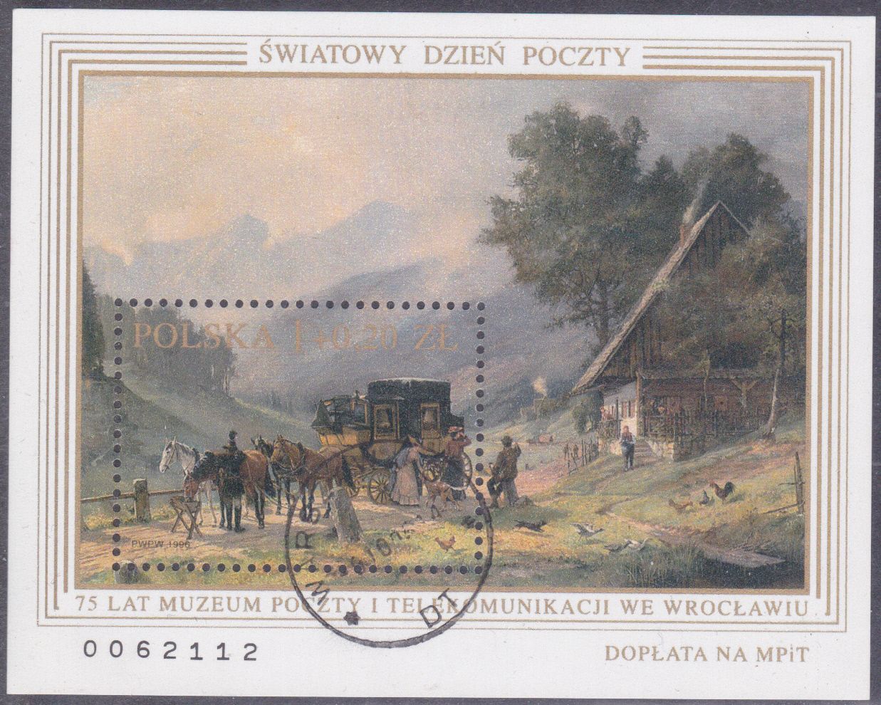 In Polen erschien zum Weltposttag und zu 75 Jahre Post- und Fernmeldemuseum in Breslau dieser Block (MiNr Block 128 mit Marke MiNr 3626) mit dem Gemälde "Postkutsche in Jagniatków" nach einem Gemälde Taeger.