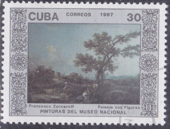 Eine Marke aus Kuba (MiNr 3078) mit eine Landschaft mit Personen von Francesco Zuccarelli.