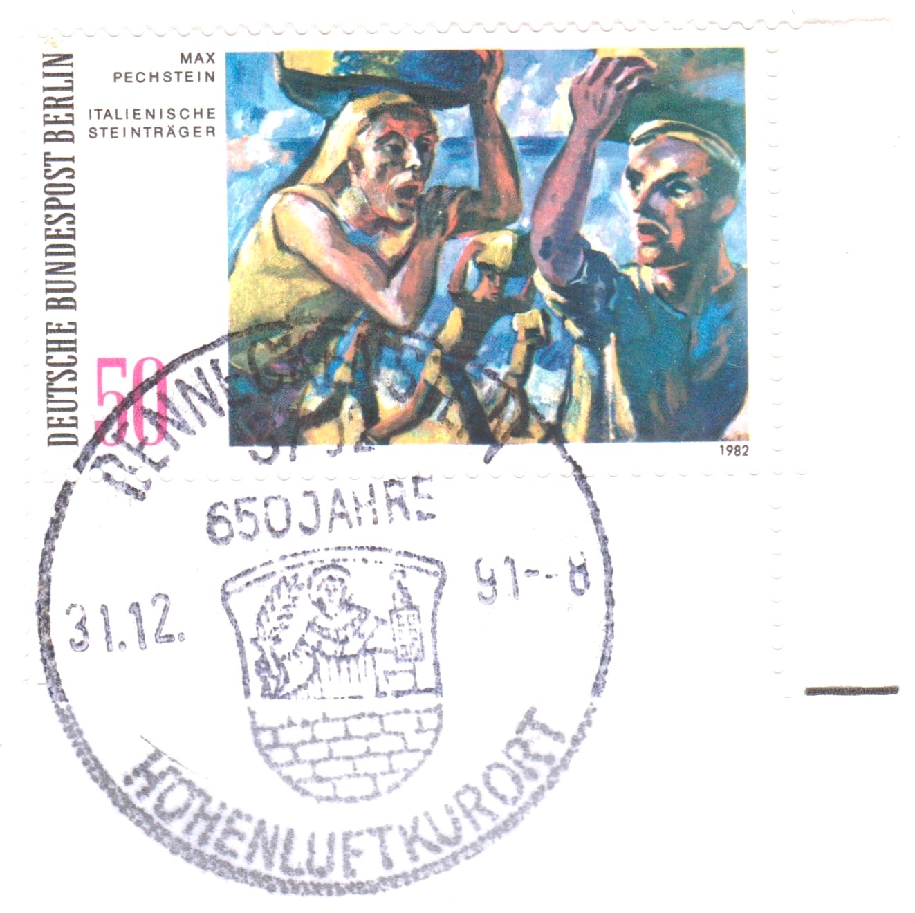 Die Marke aus Berlin (MiNr 678) mit dem Gemälde "Italienische Steinträger" von Max Pechstein wurde hier am 21.10.1982 portogerecht auf einer Drucksache bis 20g als Frankatur benutzt.