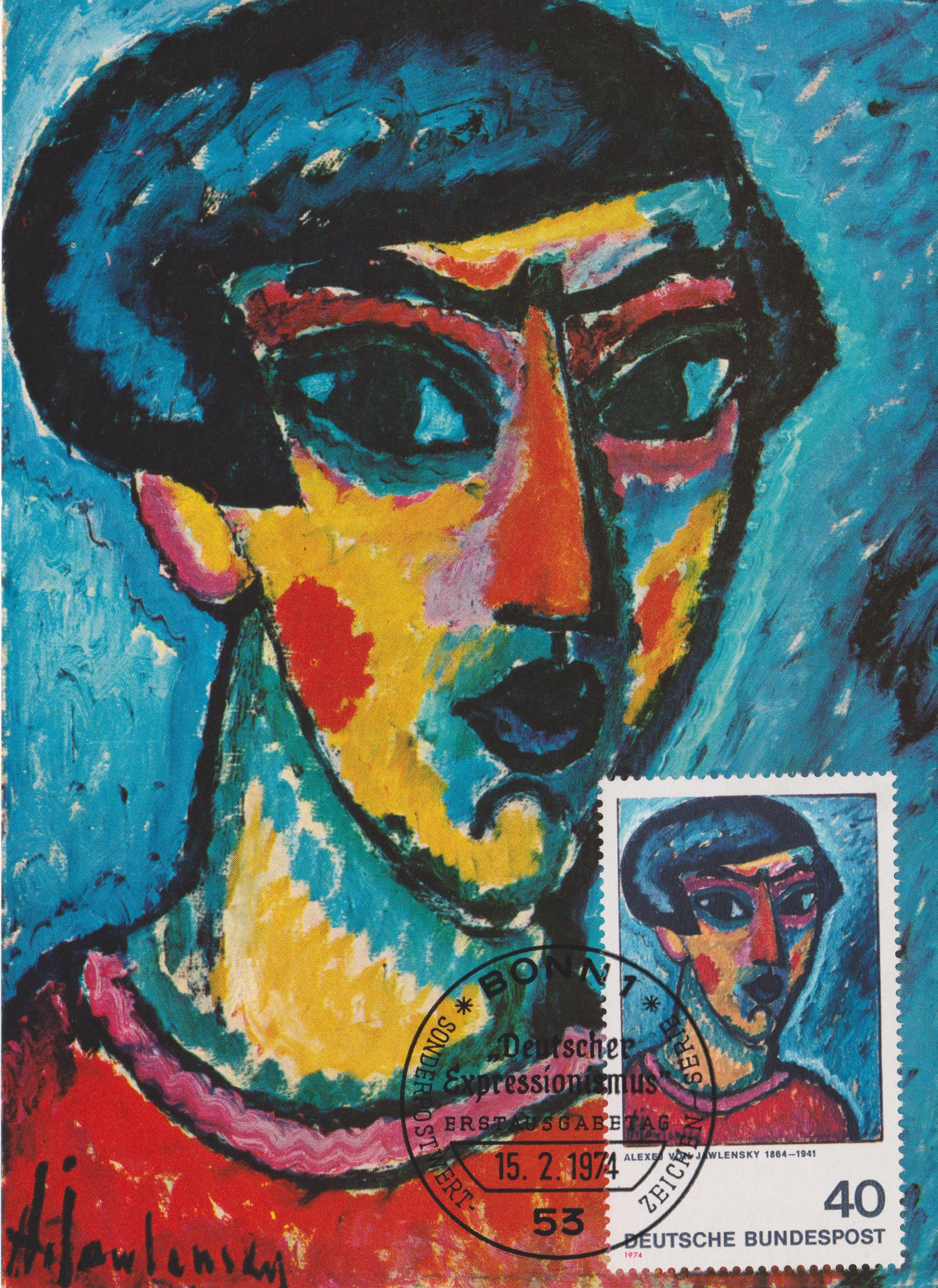 In der Serie "Deutscher Expressionismus" erschien am 15.02.1974 MiNr. 799 mit dem Werk "Kopf in Blau" von Alexej von Jawlenski, hier auf bildgleicher Maximumkarte: