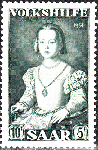 Die Marke zu 10+5 Fr der Volkshilfe-Serie 1954 des Saarlandes (MiNr 355) zeigt ein Porträt von Maria de Medici, der Tochter des Herzogs Cosimo I. von Florenz, das von Bronzino gemalt wurde.
