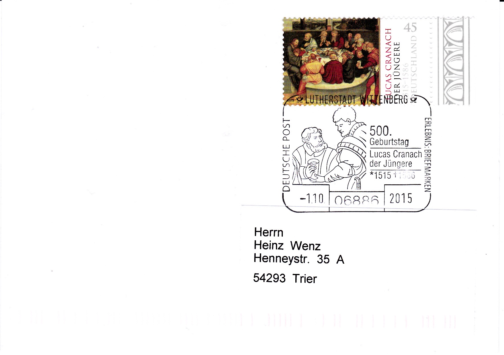 Nach den einfallslosen Ersttagsonderstempel aus Bonn und Berlin hier ein Stempel vom Ersttag der Marke aus der Lutherstadt Wittenberg mit einem Detail des Altarbildes der Stadt- und Pfarrkirche St. Marien in Lutherstadt Wittenberg.