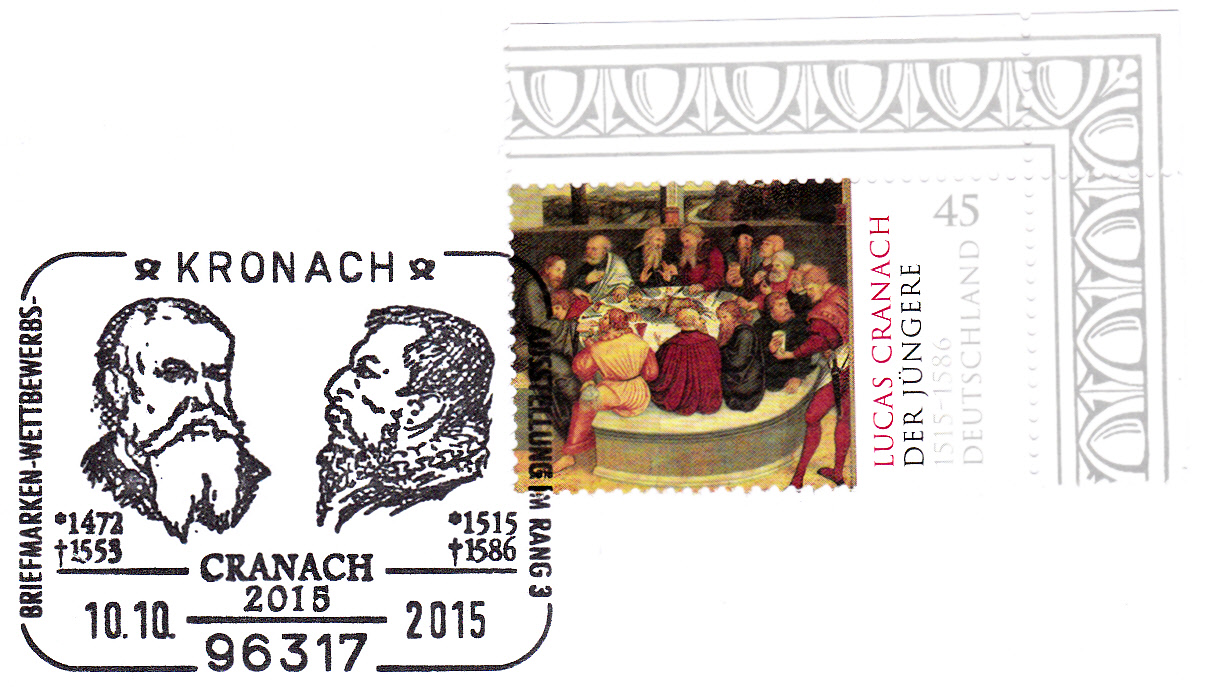 Sonderstempel vom 10.10.2015 aus Kronach anlässlich der Briefmarkenausstellung "CRANACH 2015". Im Stempelbild sehen wir jeweils ein Porträt von Lucas Cranach dem Ältere (links) und Lucas Cranach dem Jüngere (rechts).