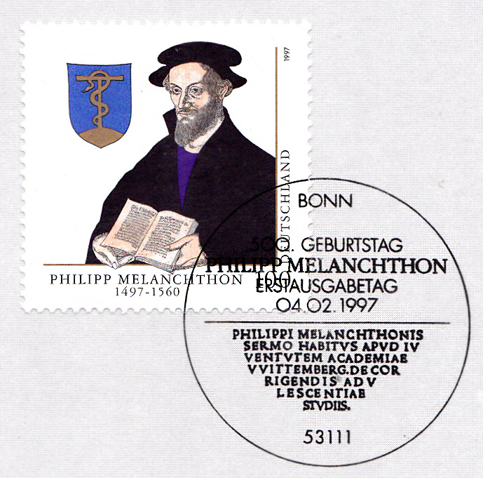 Zum 500. Geburtstag von Philipp Melanchthon ist bei der Deutschen Post eine Sondermarke erschienen (MiNr 1902). Sie zeigt Philipp Melanchthon nach einem Gemälde von Lucas Cranach d. J.