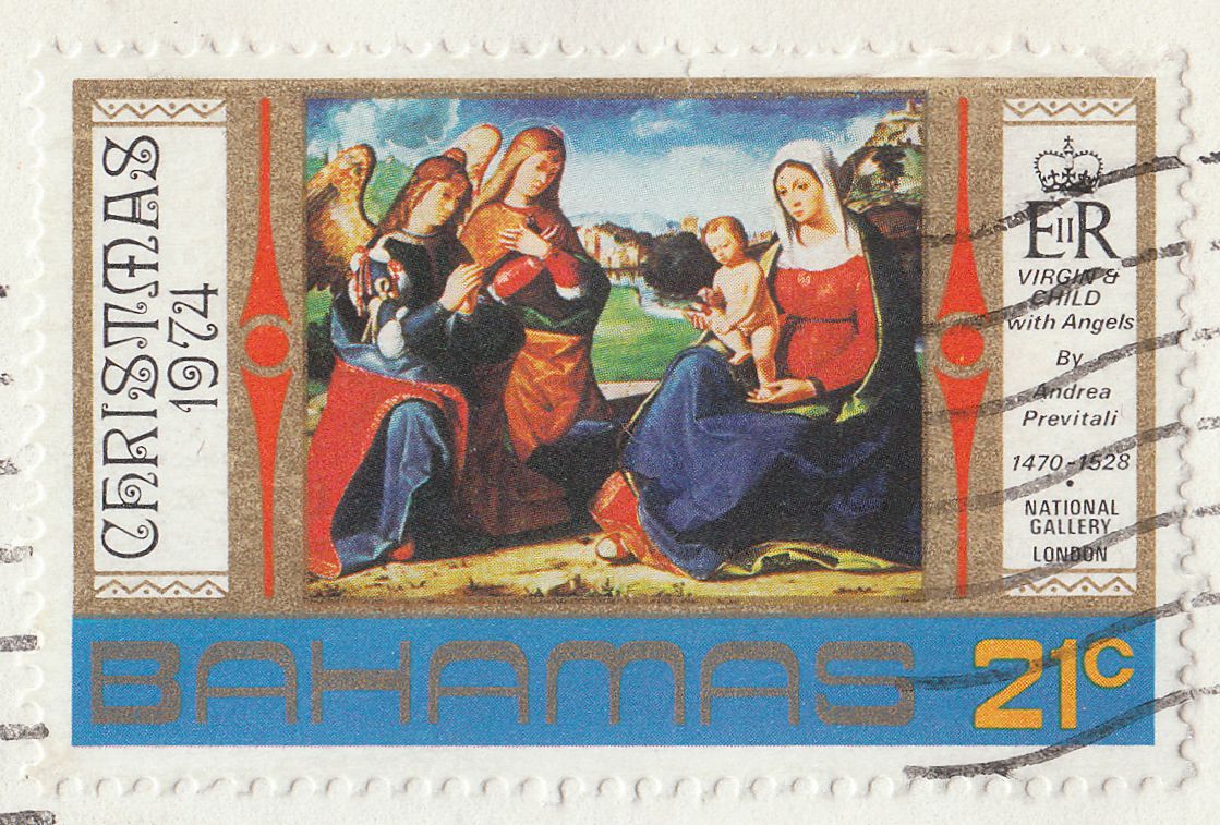 Die Weihnachtsmarke 1974 der Bahamas zeigt einen Ausschnitt aus diesem Gemälde "Die Jungfrau und das Kind von zwei Engeln verehrt" von Andrea Previtali, das Bestandteil der britischen Nationalgalerie in London ist: