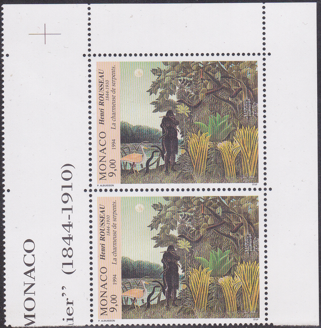In Monaco erschien eine Marke (MiNr 2208) zum 150. Geburtstag von Henri Rousseau. Sie zeigt sein Werk "Die Schlangenbeschwörerin". Hier ein senkrechtes Paar der Marke vom rechten oberen Bogenrand. Die Bögen haben zwei senkrechte Reihen mit fünf Marken. Zwischen den Reihen befindet sich ein Zwischensteg.