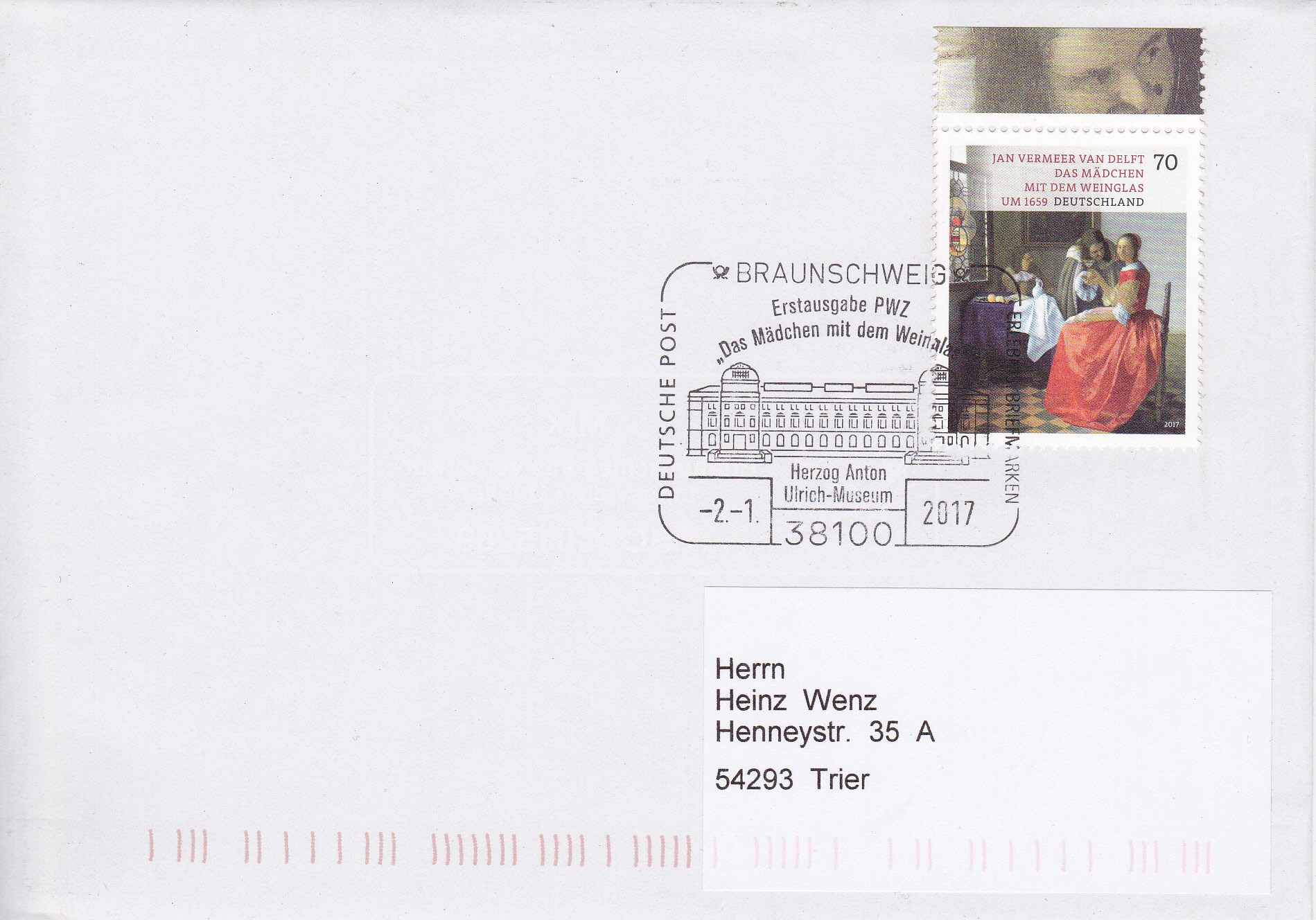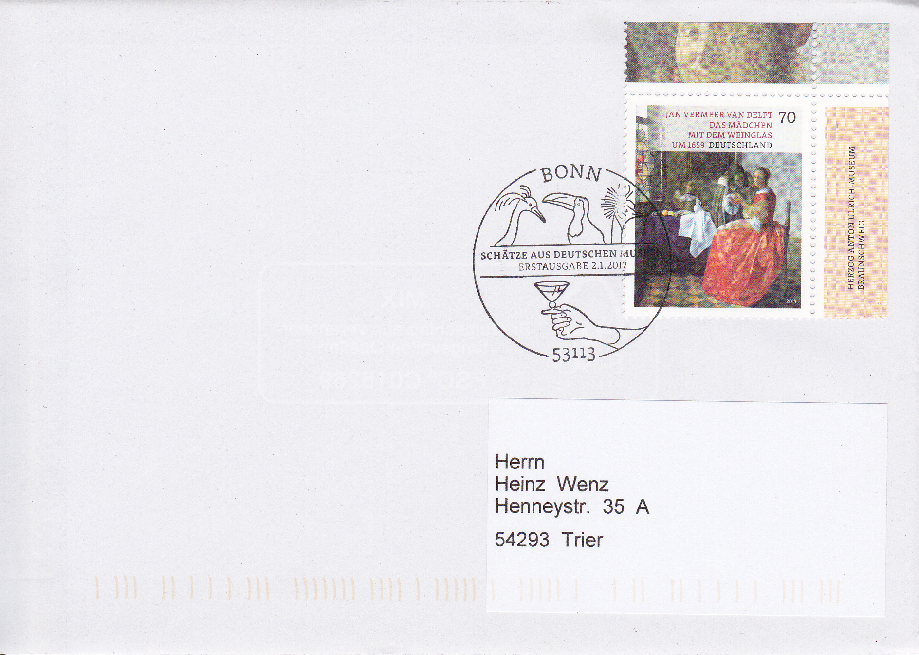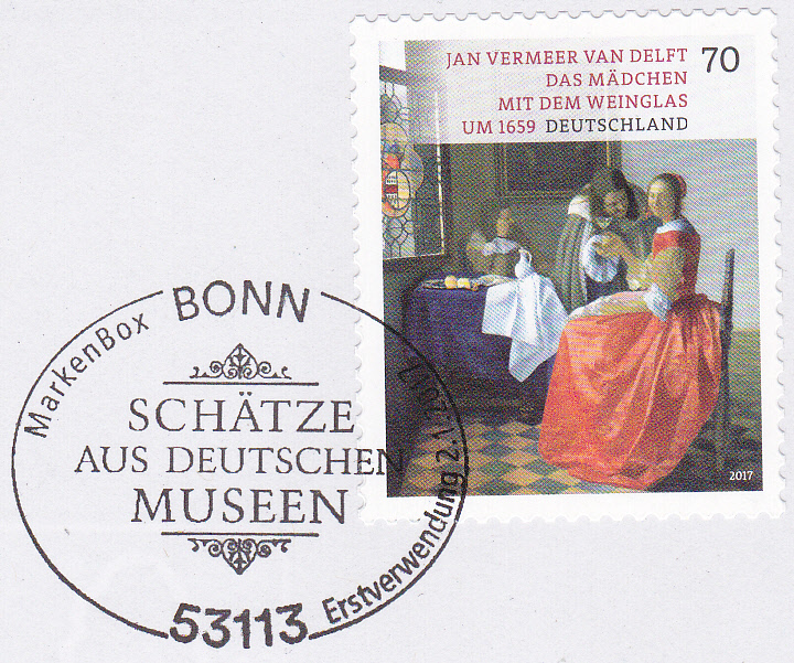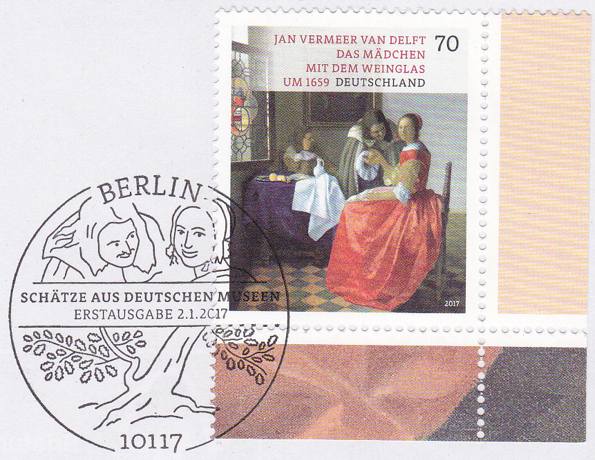 Bei der Deutschen Post AG erschien am 2.1.2017 in der Serie "Schätze aus deutschen Museen" eine Marke (MiNr 3274) mit dem Gemälde "Das Mädchen mit dem Weinglas" von Jan Vermeer van Delft. Das Gemälde befindet sich im Herzog-Anton-Ulrich-Museum in Braunschweig.