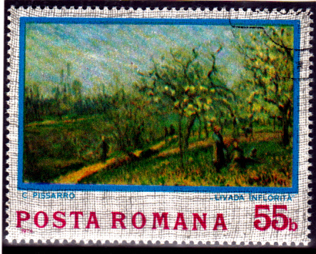 Das Motiv dieser Marke aus Rumänien ist das Gemälde von Camille Pissarro mit dem Titel "Obstgärten in der Blüte".