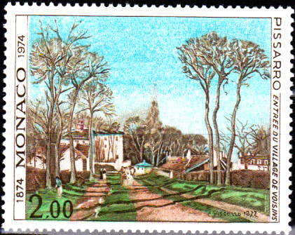 In der Serie "100 Jahre Impressionismus" aus Monaco vom 12. Nov.1974 wurde auch Pissarro eine Briefmarke gewidmet. Sie zeigt den "Dorfeingang von Voisins".