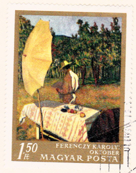 In einer Serie "Gemälde der Nationalgalerie Budapest: Meister des 20. Jahrhunderts" ist in Ungarn eine Marke (2372 A) mit seinem Werk "Oktober" erschienen. Auf diesem Brief per Einschreiben nach Deutschland wurde eine Marke mit dem Ersttagsonderstempel entwertet. Rückseitig wurde eine Marke zur Vervollständigung des Portos verklebt.