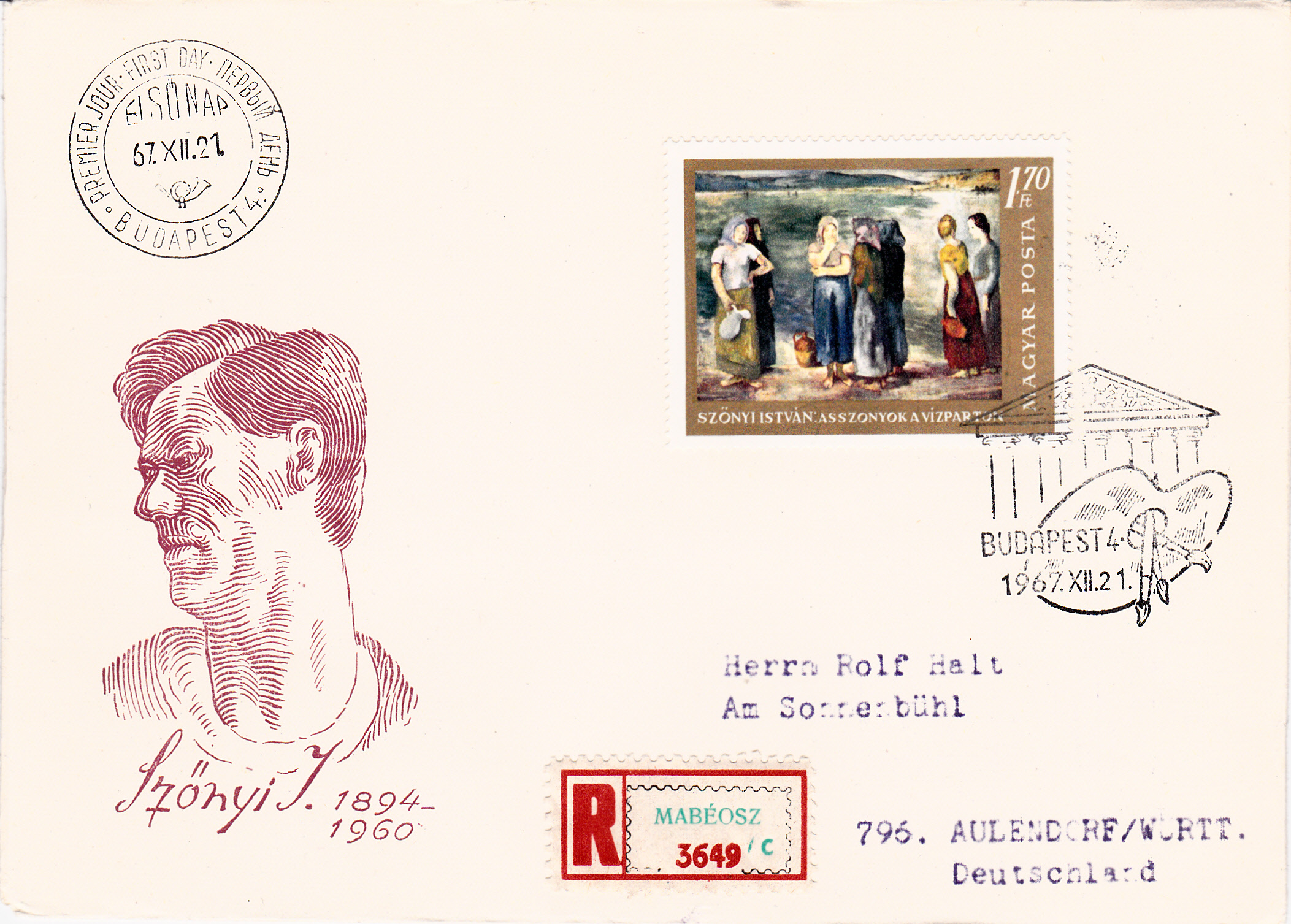 In einer Serie "Gemälde der Nationalgalerie Budapest Meister des 20. Jahrhunderts" ist in Ungarn 1967 auch eine Marke (MiNr 2373 A) mit dem Gemälde "Frauen am Ufer" von István Szönyi erschienen. Hier wurde eine Marke auf einem Brief mit Einschreiben nach Deutschland zur Frankatur verwendet. Die Marke gibt es auch geschnitten. Rückseitig wurde eine Marke zur Vervollständigung des Portos verklebt.