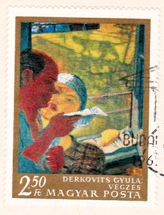 In einer Serie "Gemälde der Nationalgalerie Budapest Meister des 20. Jahrhunderts" ist in Ungarn 1967 auch eine Marke (MiNr 2375 A) mit dem Gemälde "Zwangsräumungsbeschluss" von Gyula Derkovits erschienen. Hier wurde eine Marke auf einem Brief mit Einschreiben nach Deutschland zur Frankatur verwendet.