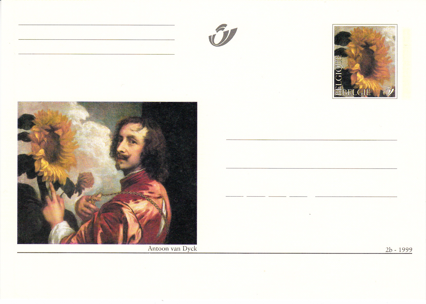 Auf dieser Ganzsache aus Belgien wird links als Illustration ein Selbstbildnis mit Sonnenblume von Anthonis van Dyck gezeigt.Im Wertstempel wird nur die Sonnenblume als Ausschnitt gezeigt.
