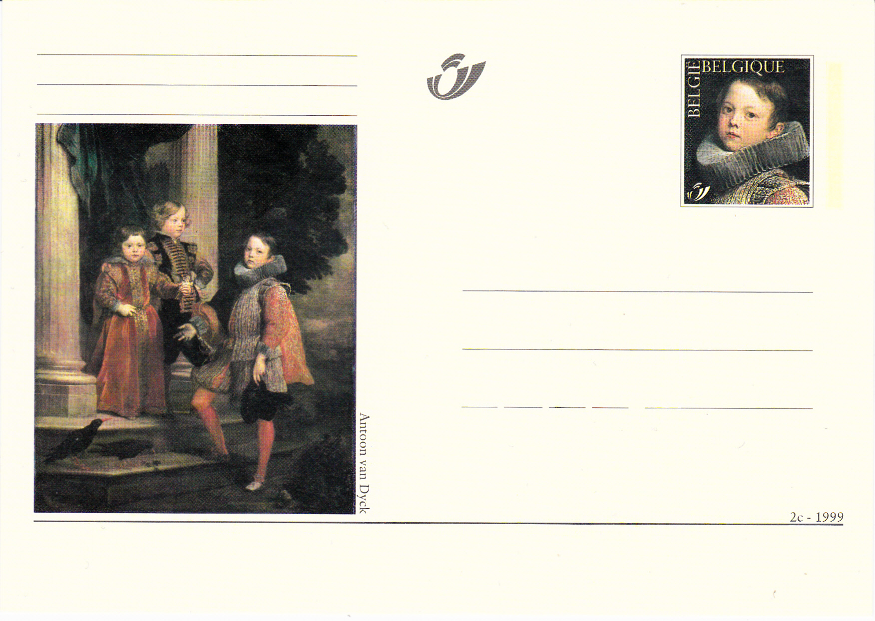 Eine weitere Ganzsachen-Postkarte aus Belgien zeigt im Zudruck das Gemälde "Die Balbi-Kinder" von van Dyck. Im Wertzeicheneindruck ist dann wieder ein Detail aus diesem Gemälde zu sehen.