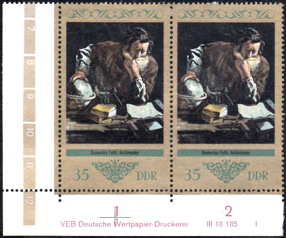 Eine Marke aus der DDR (MiNr 1896) zeigt das Gemälde "Archimedes" von Domenico Fetti. Hier ein waagerechtes Paar vom linken unteren Bogenrand mit Druckvermerk und Bogenzählnummer.