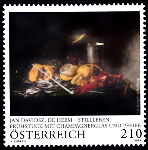 In der Serie "Alte Meistern" ist in Österreich diese Marke (MiNr 3382) mit dem Gemälde "Frühstück mit Champagnerglas und Pfeife" Gemälde von Jan Davidsz. de Heem erschienen.