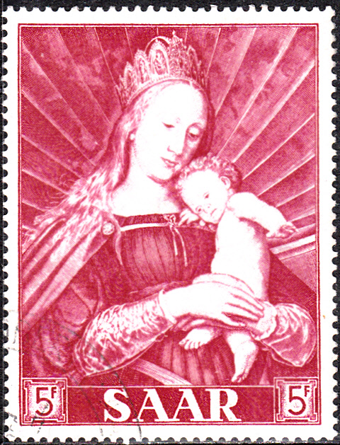Auf dieser im Saarland zum Marianischen Jahr 1954 erschienenen Marke (MiNr 351) wird ein Detail der Darmstädter Madonna (die auch Madonna des Baseler Bürgermeisters Jacob Meyer genannt wird) von Hans Holbein d. J. abgebildet. Das Werk war ehemals im Schlossmuseum Darmstadt ausgestellt, wovon sich seine Benennung ableitet. Das Bild befand sich seit 2004 als Leihgabe im Städelschen Kunstinstitut in Frankfurt am Main. 2011 verkaufte die Hessische Hausstiftung das Werk an den Kunstsammler Reinhold Würth. Seit Januar 2012 hängt es in der Johanniterhalle in Schwäbisch Hall.
