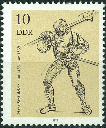 "Landsknecht mit geschulterter Hellebarde" ist der Titel dieses Kupferstiches von Hans Schäufelin. Verschiedene Schreibweisen des Namens sind überliefert, so dass "Schäufelein" auf der Marke kein Fehler ist. Der originale Druck ist Bestand des Kupferstichkabinetts der Staatlichen Museen Berlin. Die MiNr. 2347 erschien 1978.