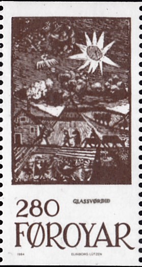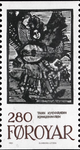 In Dänemark Färöer sind in einer Serie "Märchenillustrationen" sechs Marken mit Motive nach Linolschnitten erschienen. Auf dieser Marke (MiNr 106) wird ein Linolschnitt zum Märchen "Die Schöne mit dem Schleier" gezeigt.