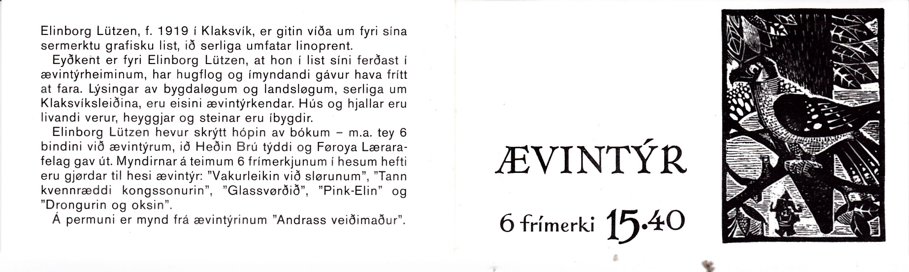 Elinborg Lützen (geb. 26. Juli 1919 in Klaksvík/Färöer; gest. 22. Nov. 1995 in Tórshavn) war die erste (und lange Zeit einzige) färöische Grafikerin. Im Laufe des Jahres 1960 illustrierte eine Ausgabe von Volksmärchen in 5 Bänden.