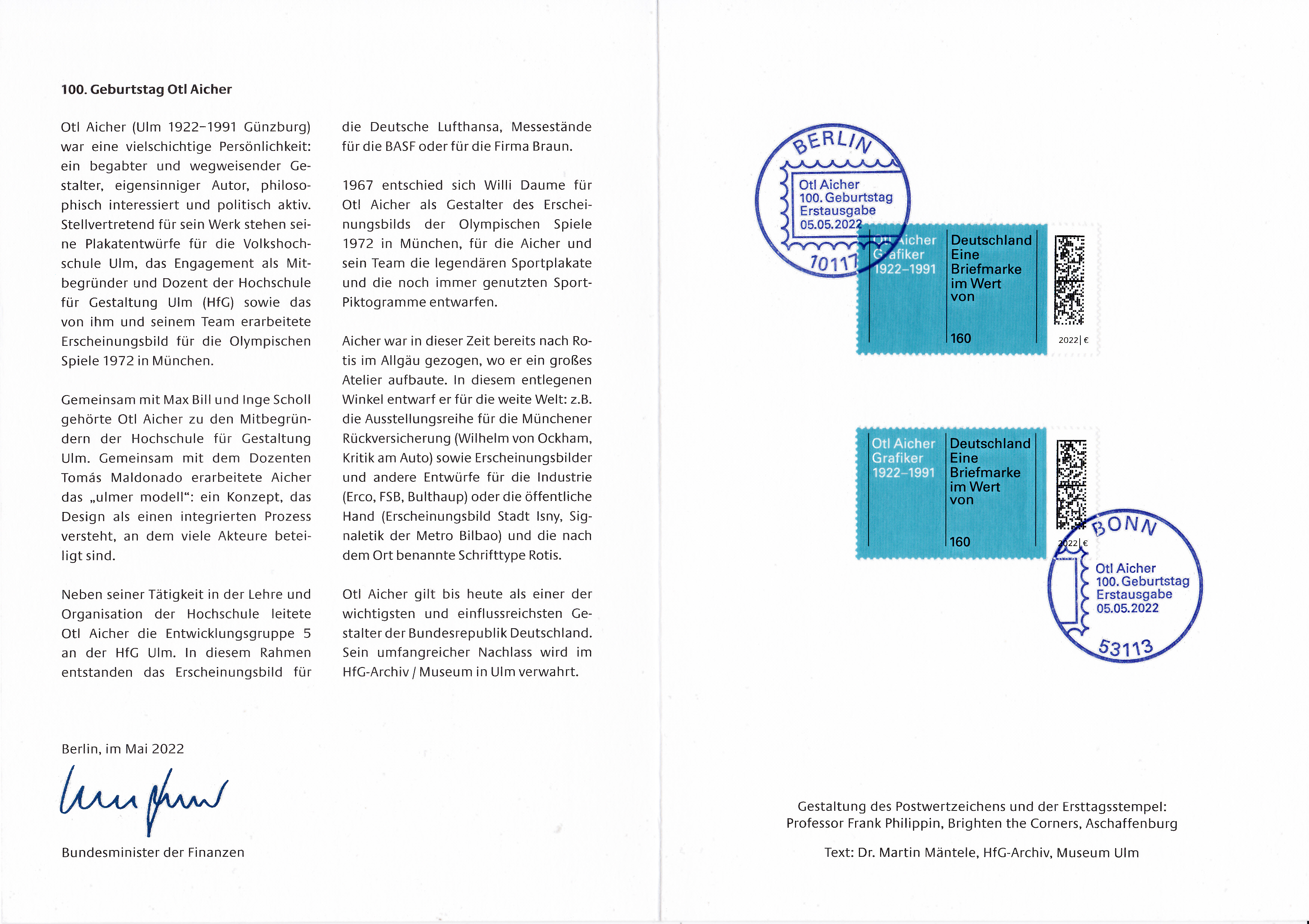 Zum 100. Geburtstag von Otto Aicher erschien bei der Deutschen Post ein Marke (MiNr 3688) mit "Weiße und schwarze Schrift auf blauem Grund".
