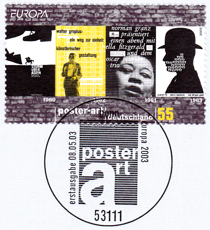 Die Europamarke 2003 der Deutschen Post (MiNr 2336) zum Gemeinschaftsthema "Plakatkunst" zeigt Plakate von Karl Oskar Blase, Michael Engelmann (1928-1966), Hans Georg Hillmann (1925-2014) und Günther Kieser (1930-2023) an einer Ziegelwand. Ich zeige hier ein postfrisches Eckrandstück der Marke, auf dem Unterrand sind die Namen der jeweiligen Grafiker zu lesen.