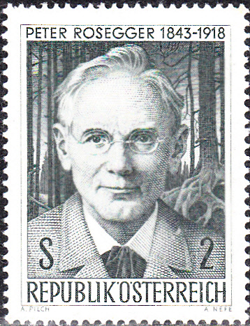 Auf der Marke zum 50. Todestag von Peter Rosegger aus Österreich (MiNr1267) wird ein Porträt von Peter Rosegger nach einem Kupferstich von Alfred Cossmann gezeigt.