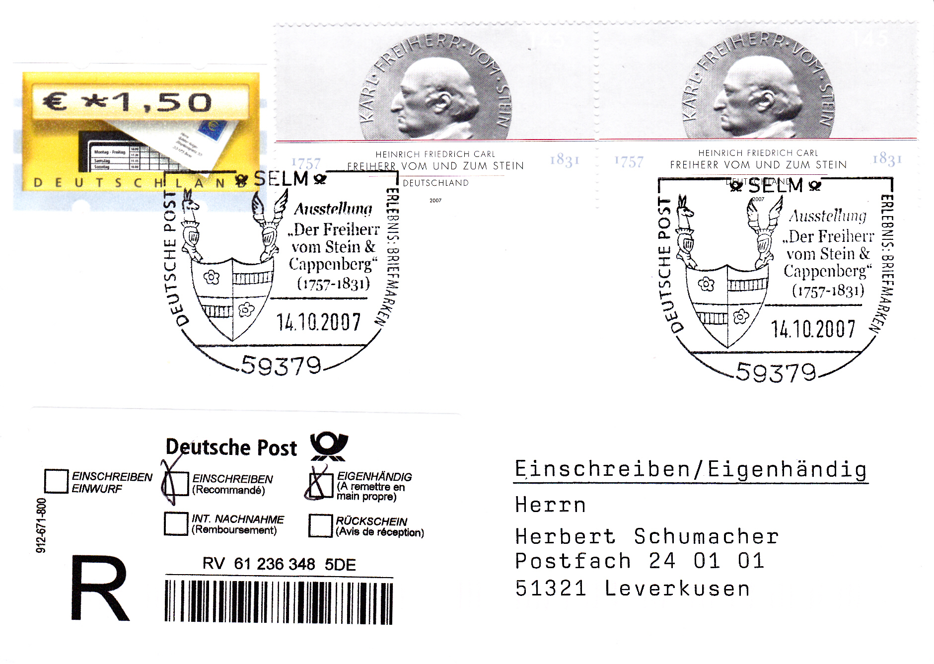 Zum 250. Geburtstag von Karl Freiherr vom und zum Stein erschien bei der Deutschen Post eine Marke (MiNr 2624). Sie zeigt eine Porzellan-Plakette von Richard Scheibe mit einem Porträt von Karl Freiherr vom und zum Stein.