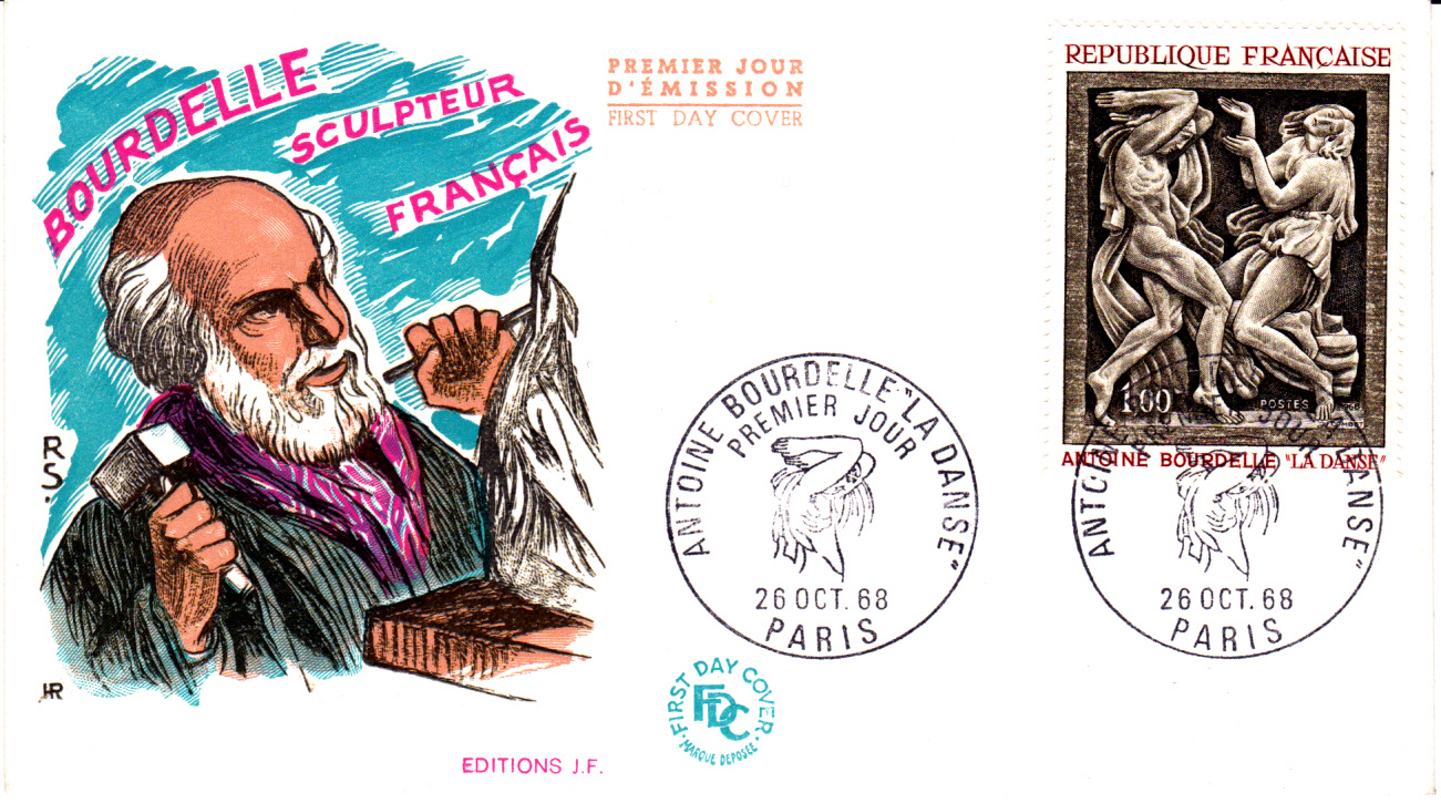 Auf diesem Ersttagsbrief, der leider nicht echt gelaufen ist, sehen wir auf der Marke die Skultur "La danse" (Der Tanz). Im Ersttagssonderstempel ist auch ein Detail dieser Skulptur abgebildet.