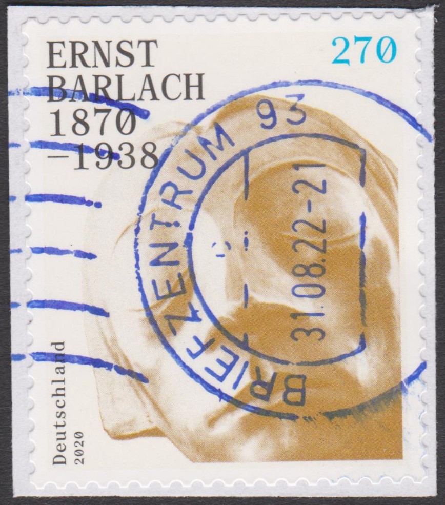 Klappkarte des Vorstandsvorsitzenden der Deutschen Post AG mit der Marke "150. Geburtstag von Ernst Barlach" (MiNr 3514) und mit dem Ersttagsonderstempel Bonn.