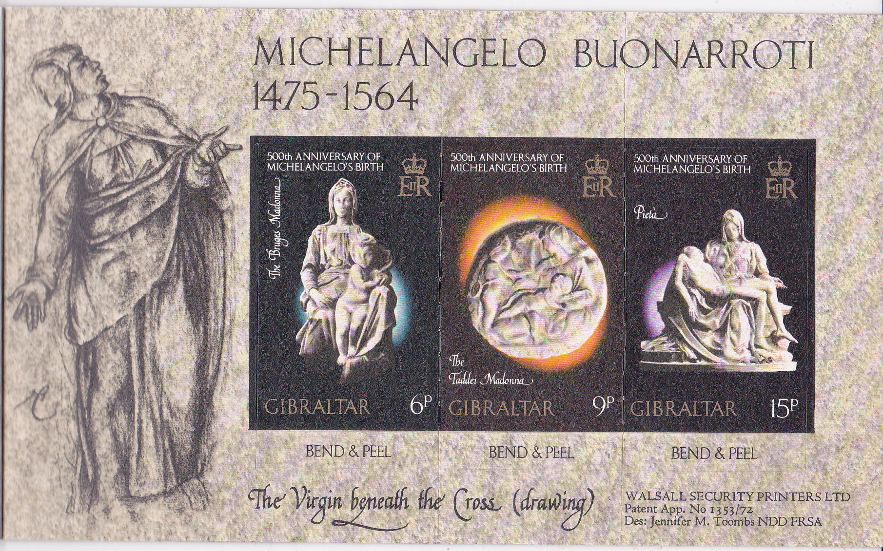 Zum 400. Todestag von Michelangelo Buonarroti erschien in Rumänien eine Marle mit seinem Porträt und einer Skulptur.