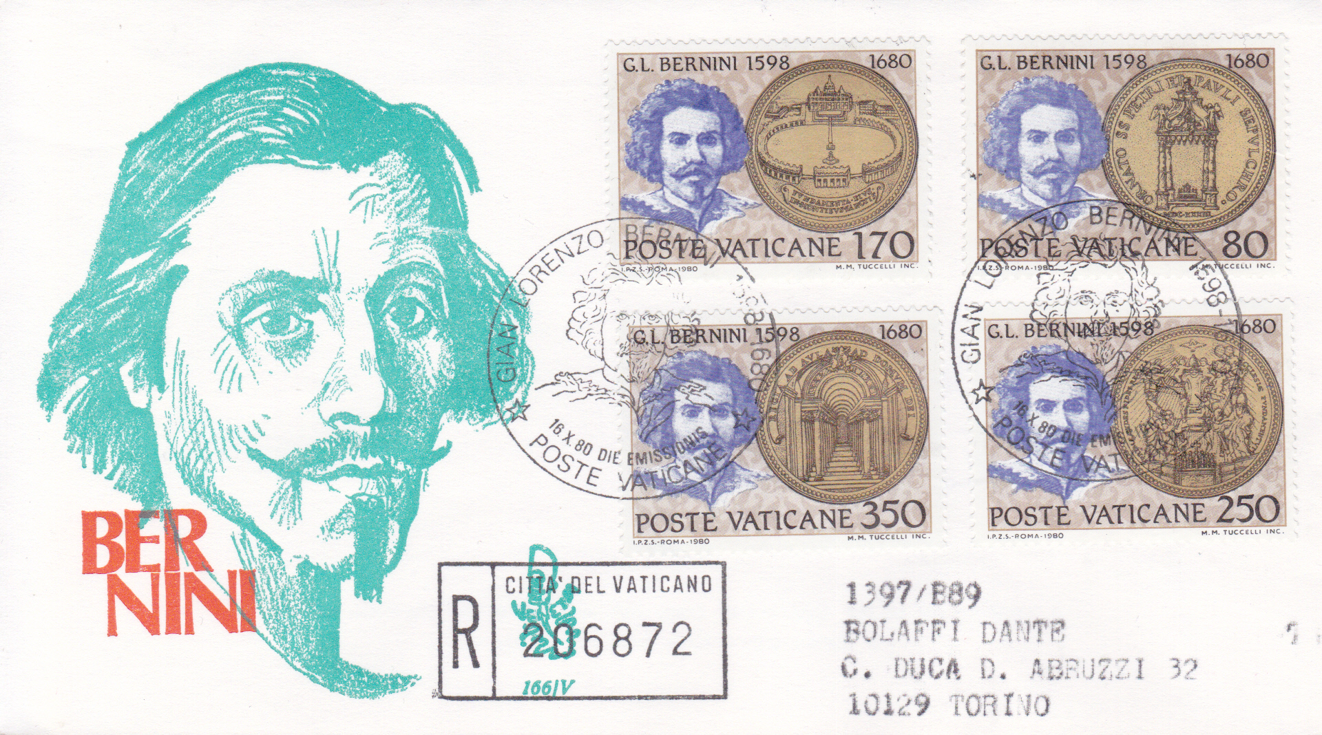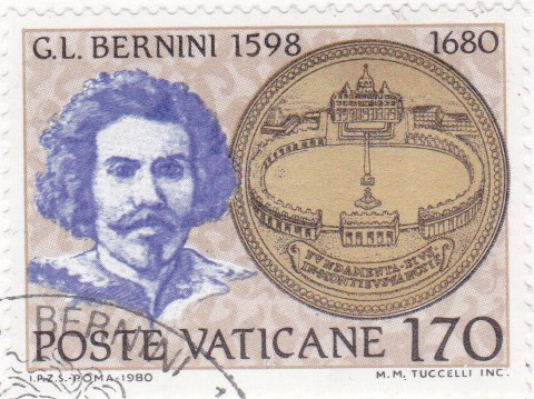 Zum 300. Todestag von Gian Lorenzo Bernini ist im Vatikan diese Marke (MiNr 771) mit einem Selbstportrait und einer Medaillen mit dem Baldachin über dem Hauptaltar des Petersdoms, einem Werken von Lorenzo Bernini .