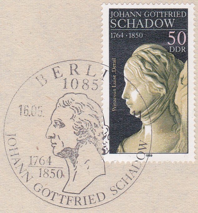 Zum 225. Geburtstag von Johann Gottfried Schadow erschien in der DDR diese Marke (MiNr 3250) mit dem Kopf von Prinzessin Luise, einem Detail aus dem Doppelstandbild der Prinzessinnen Luise und Friederike von Preußen von J. G. Schadow.
