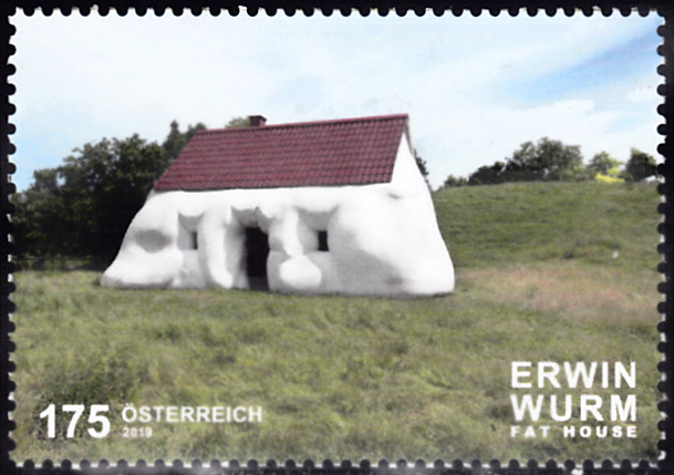 Auf dieser Marke aus Österreich (MiNr 3447) zeigt das "Fat House" einen Skulptur von Erwin Wurm (*1954) im Skulpturenpark des Universalmuseums Joanneum, Premstätten. Das begehbare Plastikhaus mit einer Videoprojektion im Inneren ist eine von mehreren fat sculptures des Künstlers, welche die Konsumgesellschaft und ihre kleinbürgerlichen Statussymbole auf humoristische Weise kritisieren.