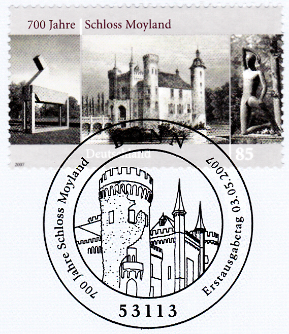 Auf dieser Marke zum Jubiläum "700 Jahre Schloss Moyland in Bedburg-Hau" (MiNr 2602) werden von links nach rechts die Skulptur "Großes Pferd" von Erwin Heerich, das Schloss Moyland während der neugotischen Umgestaltung und die Skuptur" Aufstehender Jüngling" von Roland Friederichsen gezeigt.