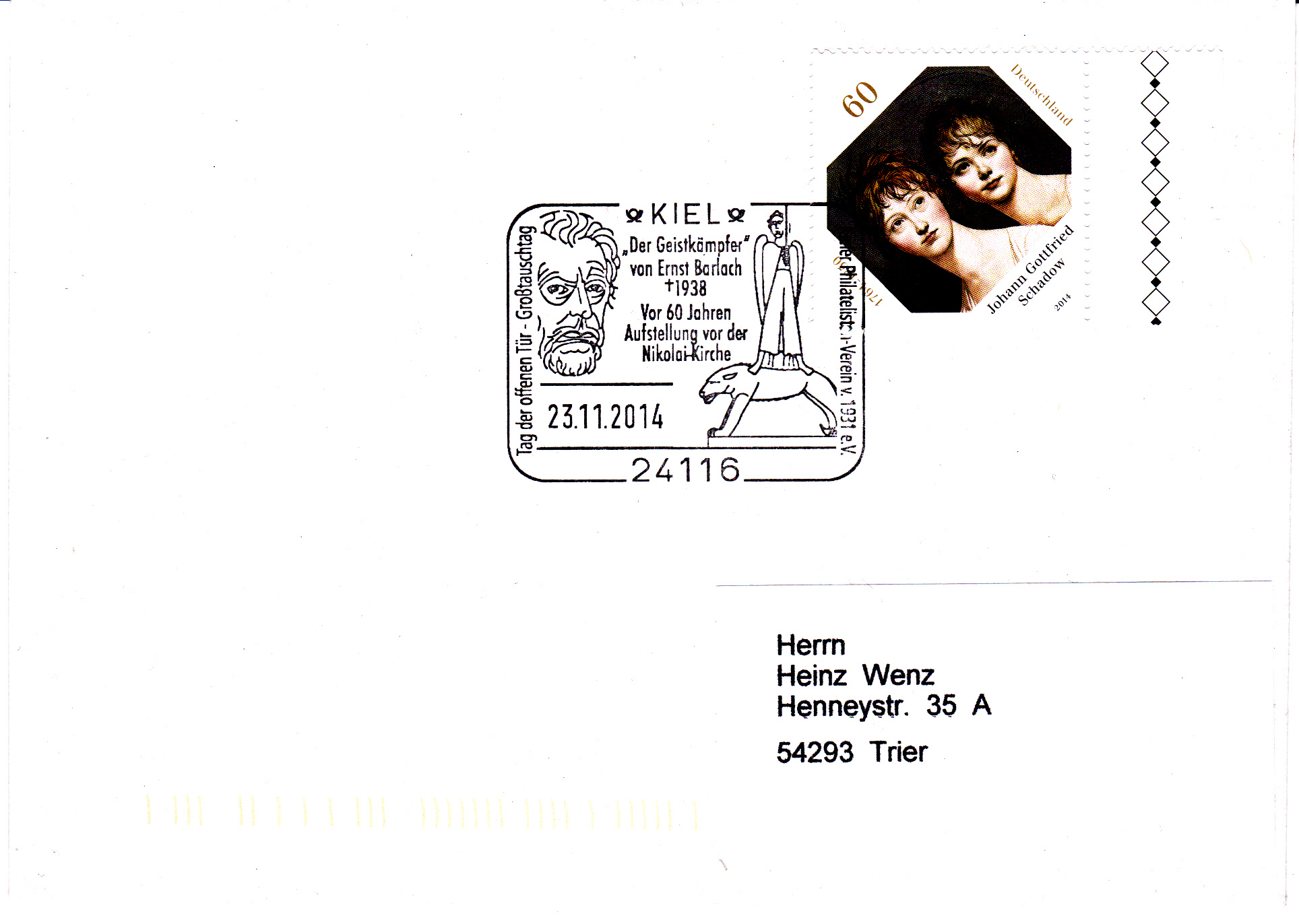 Sonderstempel aus 24115 Kiel vom 23.11.2014. Im Stempelbild abgebildet sind: Kopfbild von Ernst Barlach (nach einem Selbstporträt von 1928) und "Der Geistkämpfer", ein Werk von ihm, ebenfalls aus dem Jahre 1928, das seit 1954 vor der Nikolai-Kirche in Kiel steht.