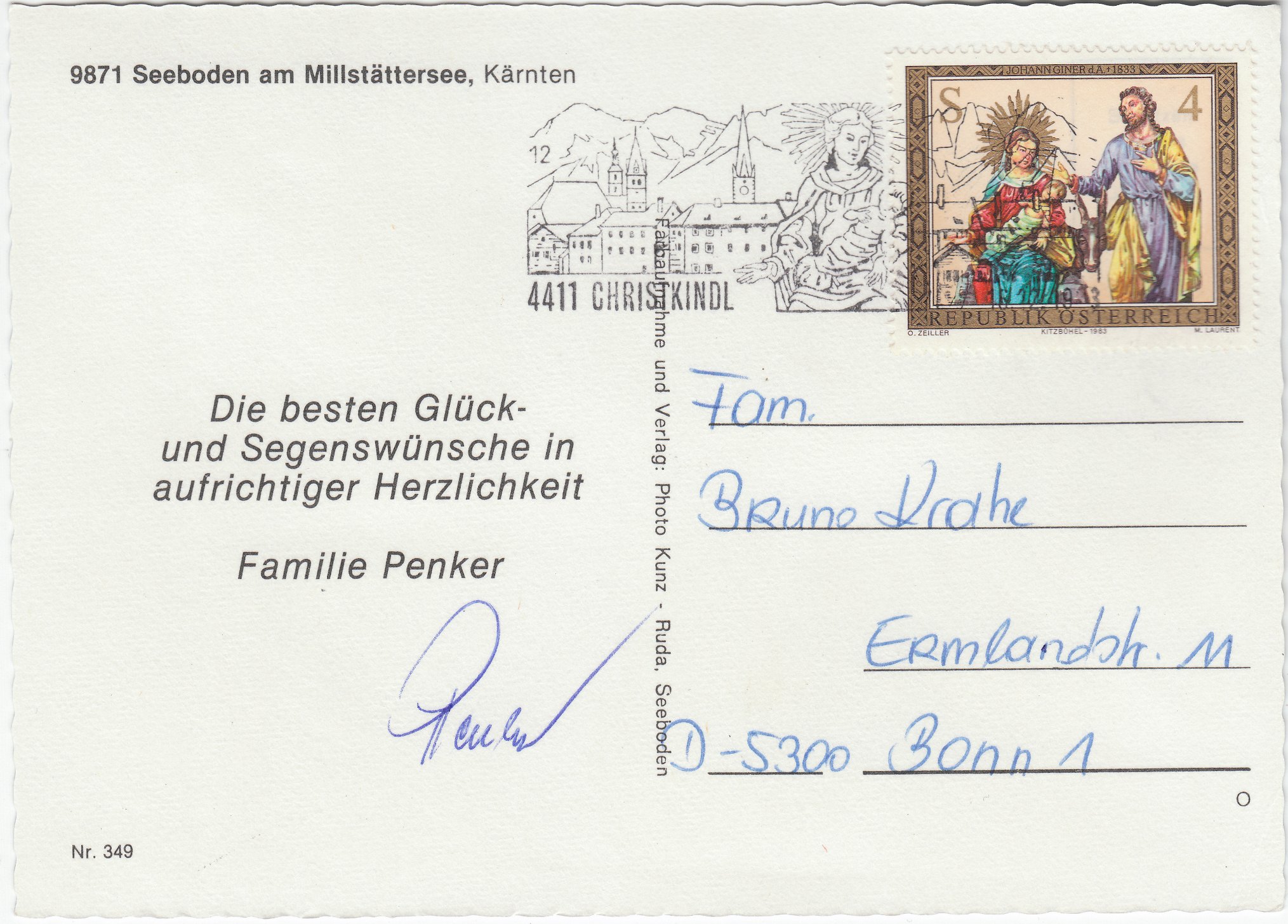 1983 veröffentlichte die Österreichische Post eine Weihnachtssondermarke mit Krippenfiguren von Johann Giner dem Älteren, hier entwertet mit einem zum Motiv der Briefmarke passenden Stempel aus Christkindl: