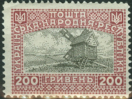 Auf dieser Marke der Ukraine ist als Motiv eine Windmühle dargestellt, die wegen des Getreidefeldes als Bildinhalt sicher eine Kornmühle dokumentieren soll.