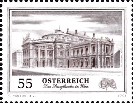 Auf dieser Marke aus Österreich (MiNr 2555) zum 50. Jahrestag der Wiedereröffnung wird das Burgtheater in Wien gezeigt.
