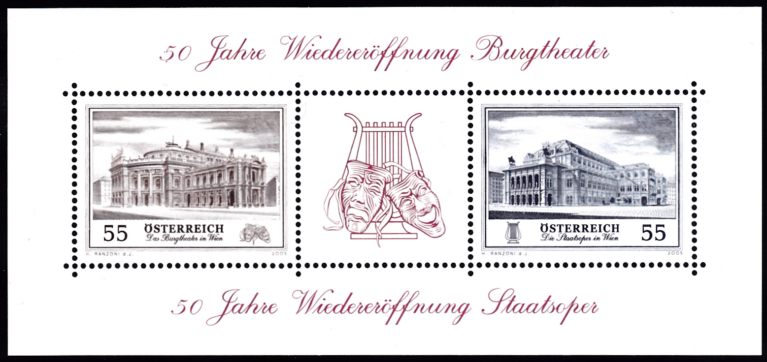 Diese Marke ist zusammen mit einer zweiten Marke in einem Block (MiNr Block 30) "50. Jahrestag der Wiedereröffnung von Burgtheater und tSaatsoper, Wien" erschienen. Hier zeige ich einen postfrischen Block.