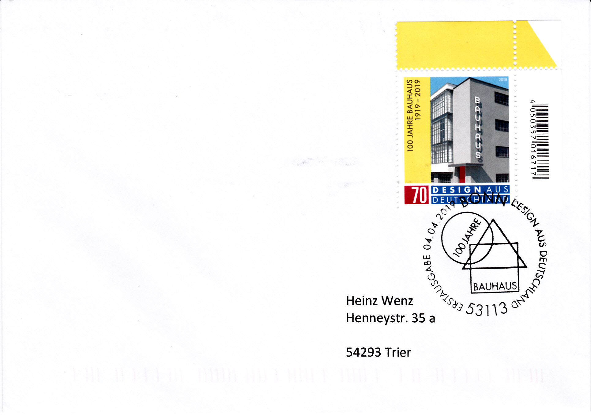 Es folgt nun ein Brief mit der gleichen Marke und dem Sonderstempel vom Ersttag aus Dessau-Rosslau. Im Stempelbild wird das Bauhaus-Gebäude von Walter Gropius in Dessau gezeigt.
